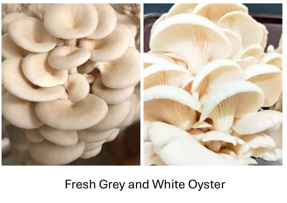 Grey and white Oyster: Mild flavor, ideal for soups, stir-fries stews. Grown on wheat straw, cotton husk, maize cobbs or groundnuts shells as substrates.